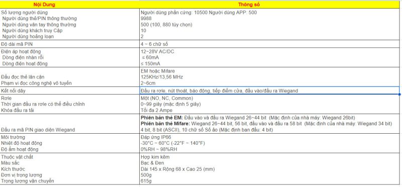 Có chức năng: cảm biến vân tay điện dung, bàn phím cảm ứng . Mở cửa bằng: vân tay,mã số,thẻ từ,điện thoại từ xa. Dung lượng 500 vân tay, 10000 thẻ và mã số,500 người dùng app , Thêm/Xóa người dùng bằng APP, Xem lịch sử ra vào trên điện thoại, Không thấm nước, phù hợp với IP66, Vỏ kim loại, chống phá hoại, Loại thẻ: Thẻ EM hoặc Thẻ Mifare, Có sẵn iOS và Android, Có thể đặt Giới hạn thời gian cho người dùng, Mật khẩu tạm thời (Mã một lần hoặc mã định kỳ),Truy cập từ xa (Hỗ trợ 3G/4G/5G), Thông báo cuộc gọi chuông cửa